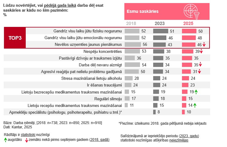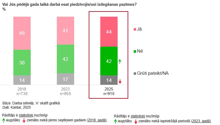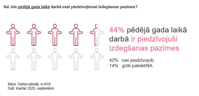 Kantar veiktā pētījuma rezultāti atklāj, ka, lai gan gandrīz 2/3 (64%) darbinieku pēdējā gada laikā ir saskārušies ar kādu emocionālu vai psiholoģisku problēmu, izdegšanas pazīmes darbā ir piedzīvojuši aptuveni 2/5 (44%) darbinieku. Līdzīgs strādājošo īpatsvars (42%) šādas pazīmes nav piedzīvojis.