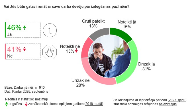 Gandrīz puse (46%) darbinieku būtu gatavi runāt ar savu darba devēju par profesionālās izdegšanas pazīmēm, kamēr 2/5 (41%) strādājošo par šiem jautājumiem nejustos droši runāt.