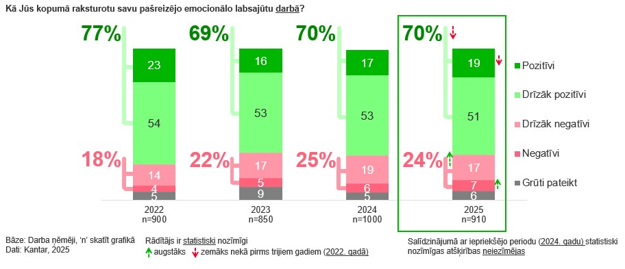 Trīs gadu laikā (kopš 2022. gada) nozīmīgi ir samazinājies to darbinieku īpatsvars, kuri savu emocionālo labsajūtu darbā raksturo kopumā pozitīvi (no 77% uz 70%), vienlaikus palielinoties to strādājošo īpatsvaram, kuri savu emocionālo labsajūtu darbā vērtē kopumā negatīvi (no 18% uz 24%).