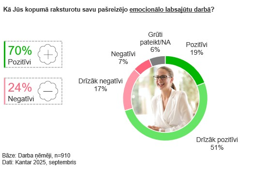 Pētījuma rezultāti liecina, ka 70% Latvijas strādājošo savu emocionālo labsajūtu darbā vērtē kopumā pozitīvi, tostarp puse (51%) norādījuši, ka to vērtē “drīzāk pozitīvi”. Izteikti pozitīvi (19%) vērtējumi ir sniegti salīdzinoši retāk.